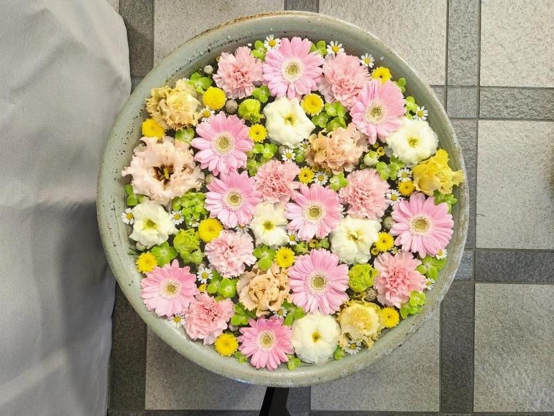 江東区役所2階入口 るーくる横にも花手水を飾ります。