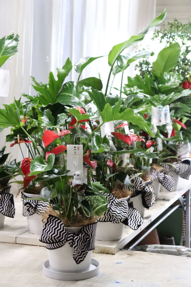 アンスリウムにセロームやオーガスタ、ネオレゲリアなどのグリーンを合わせました