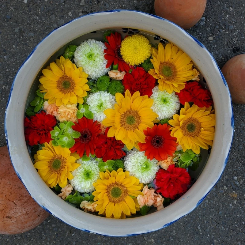 その代わりに参拝者に少しでも和んでもらおうと水の鉢を花々で飾るのが