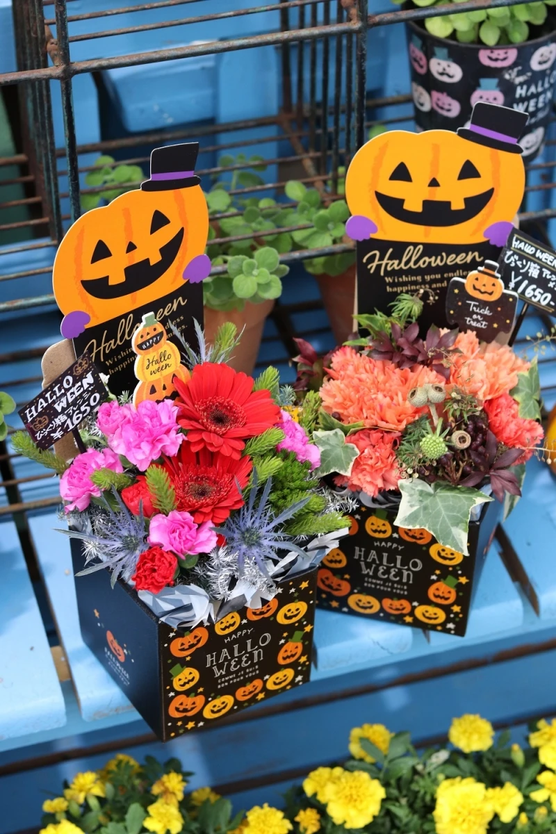かわいいハロウィンプリントのボックスにお花をたくさん詰め込んでピックも飾って