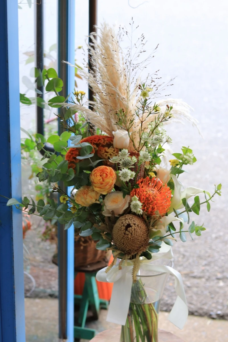 あとはネイティブフラワー(南アフリカ、オーストラリア産の花)もご希望でバンクシャー、ピンクッションを使いました。