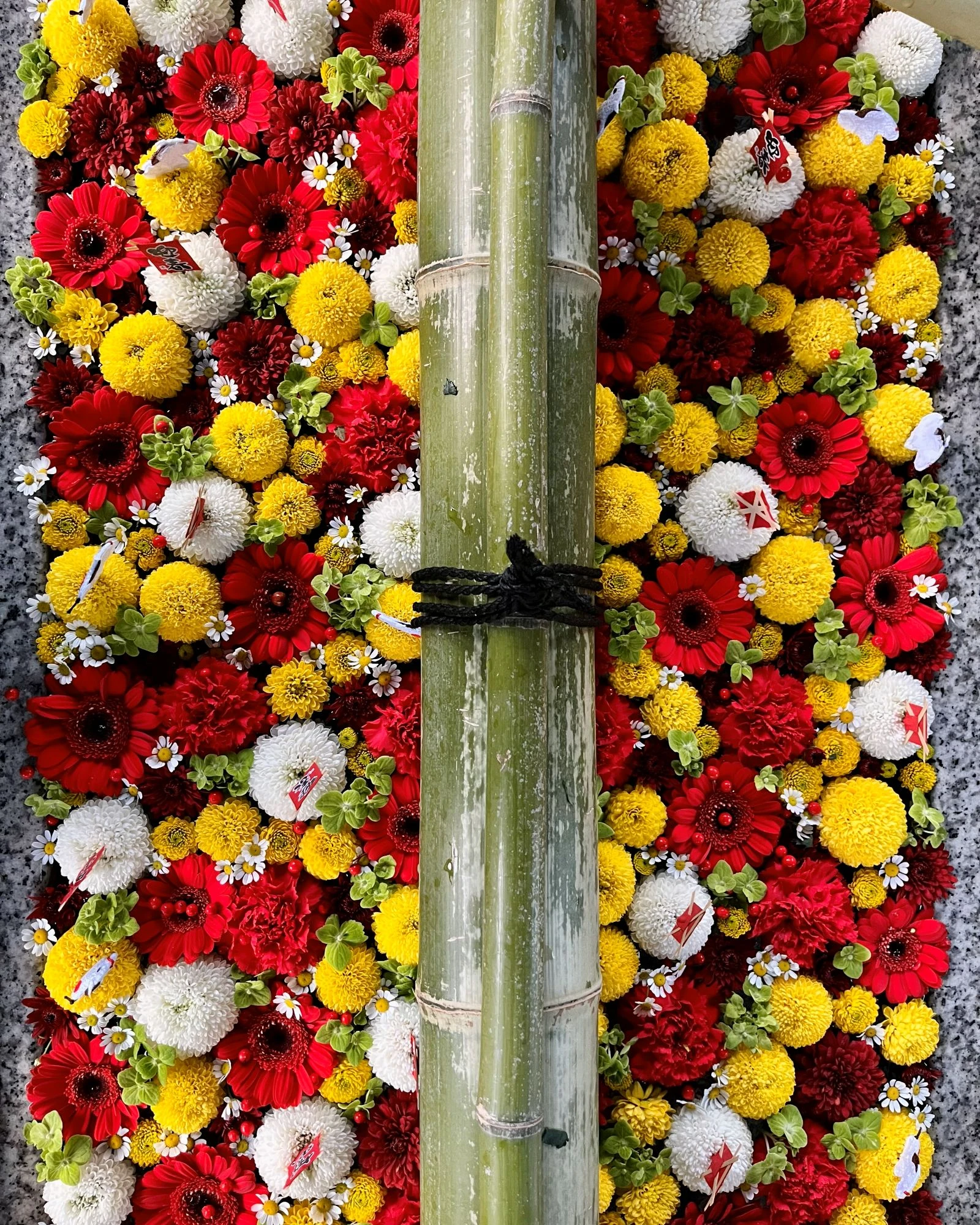 手水鉢には、赤黄白と鮮やかなまん丸のお花をたくさん浮かべました🌼🌸