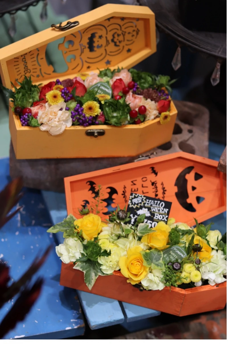 かわいいハロウィンプリントのボックスにお花をたくさん詰め込んでピックも飾って