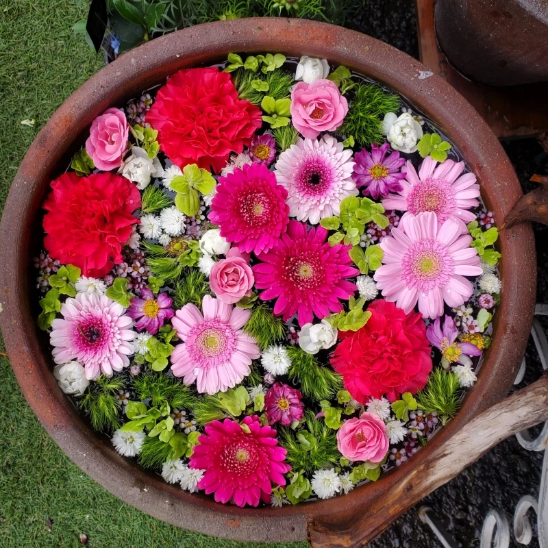 どうぶつや昆虫、キャラクター、会社のマークなどを花でアレンジしながら描きます