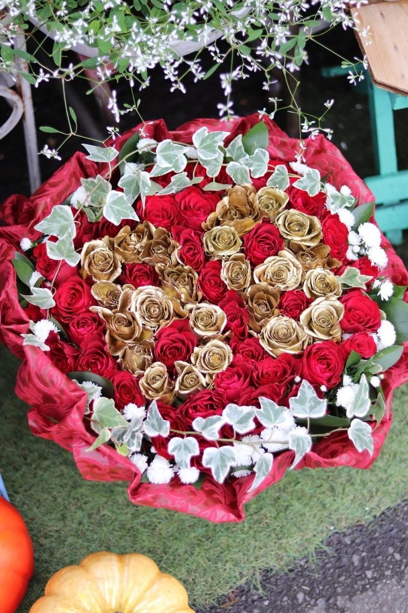 ゴールドのバラは花専用スプレーで染めて、仕上げにラメもかけてキラキラとても豪華に仕上がりました。