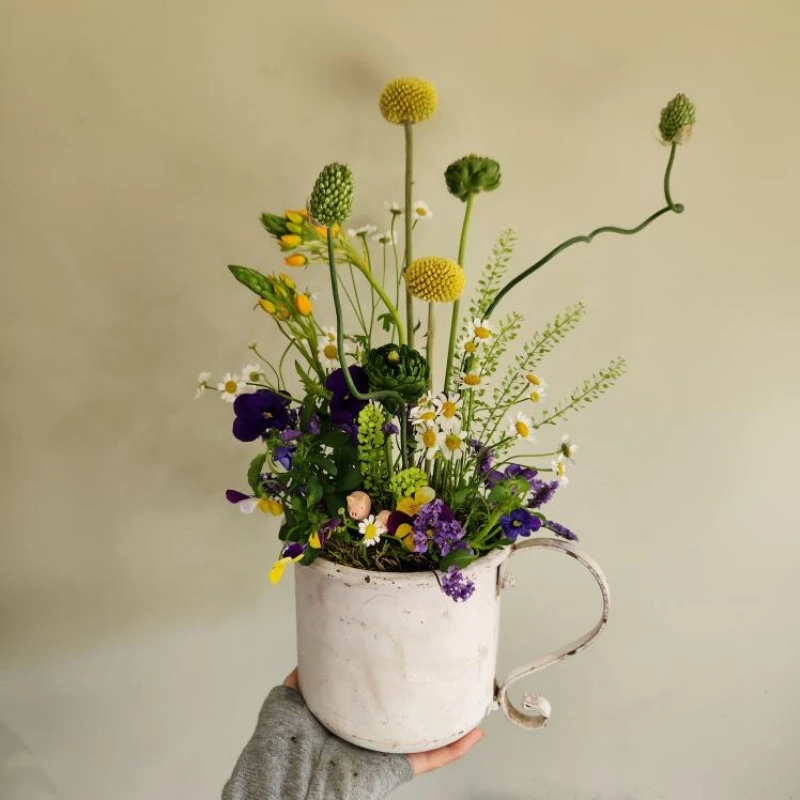 ヴィンテージ感のある器に苔をひいてお花さしました!