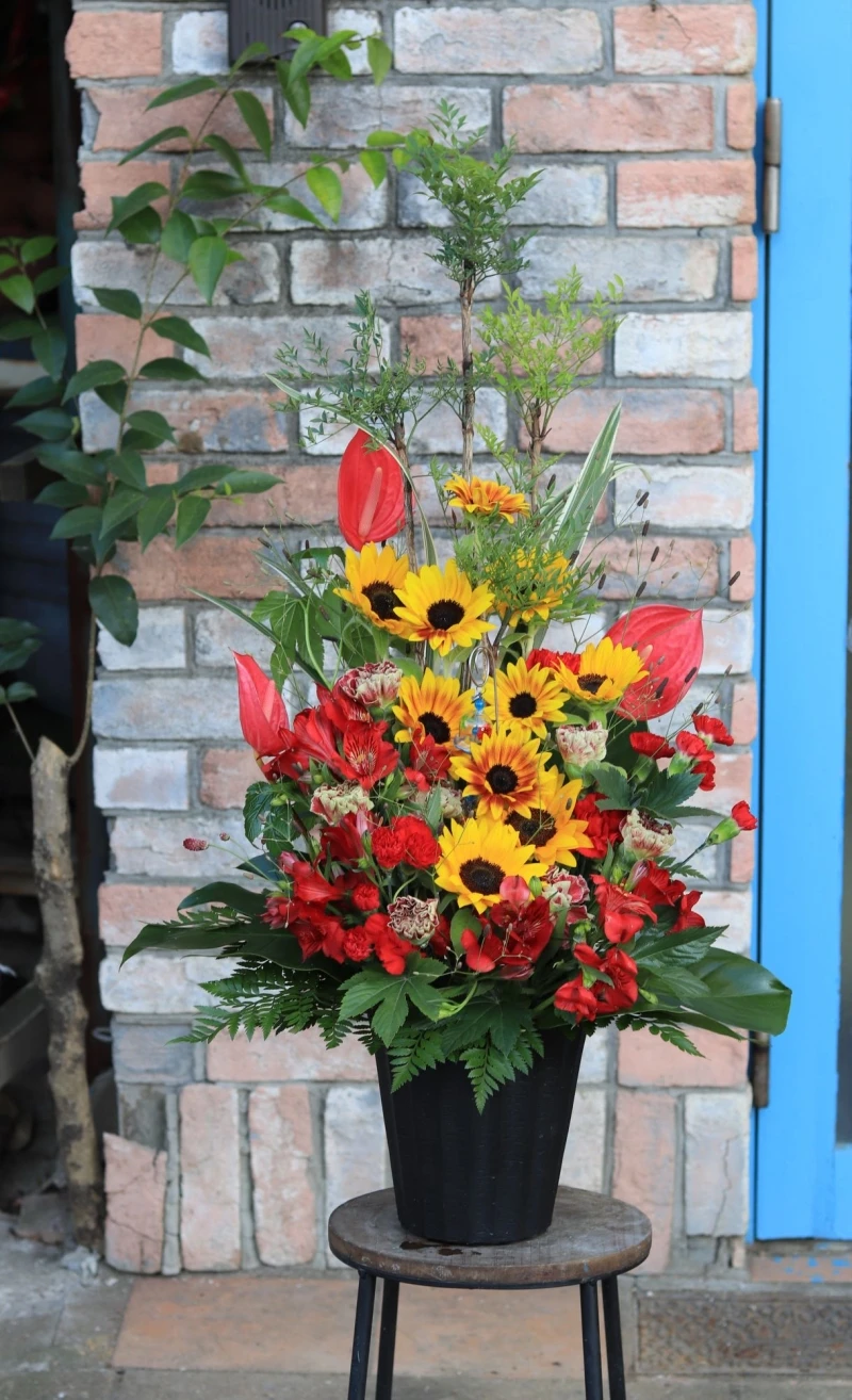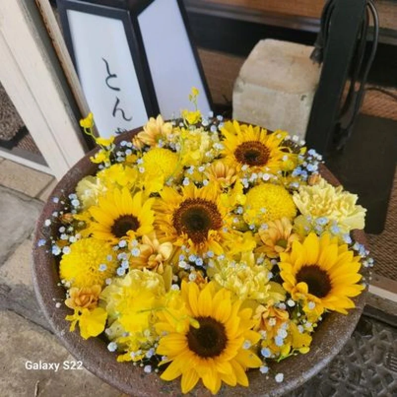 夏の花、ヒマワリは少し茶色がかったものを使いましたが