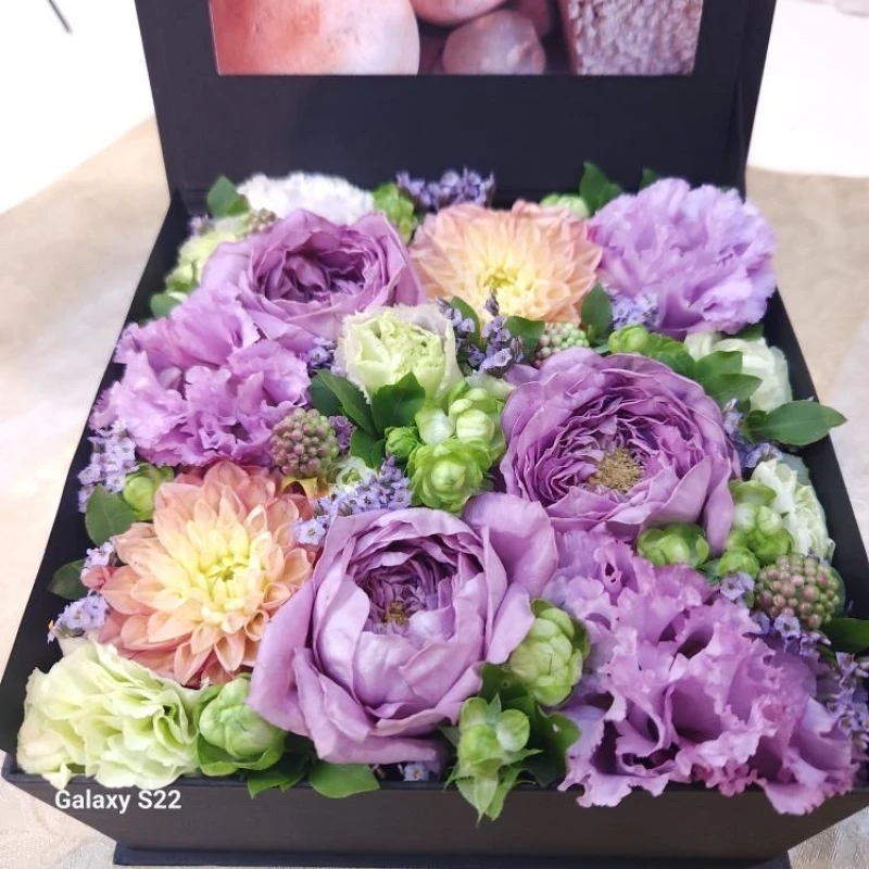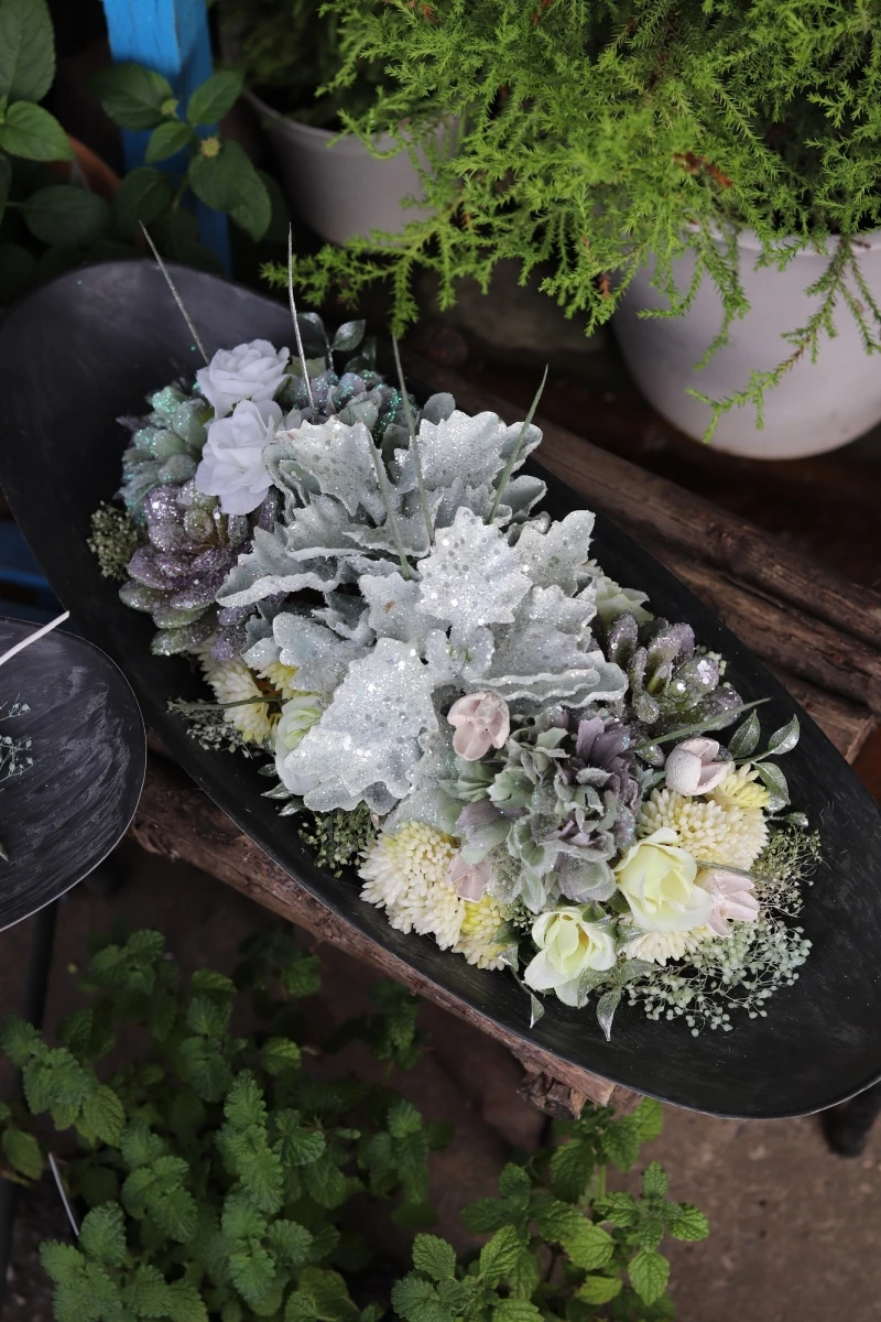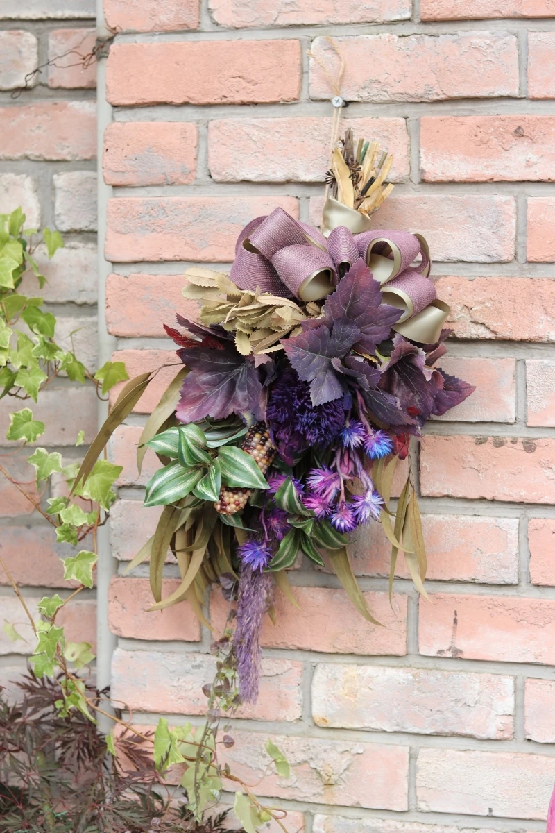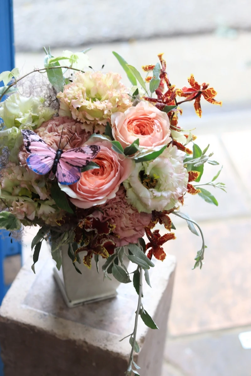 くすんだ色の花々を合わせて全体的に落ち着いた雰囲気になっています
