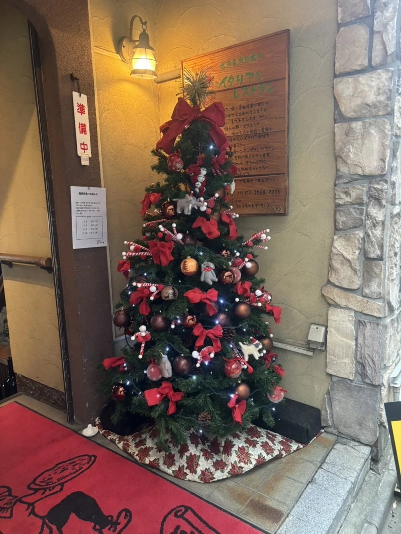 赤のチェックのテーブルクロス、天井からぶら下がるたくさんのワインボトルや壁いっぱいのボトルラベル