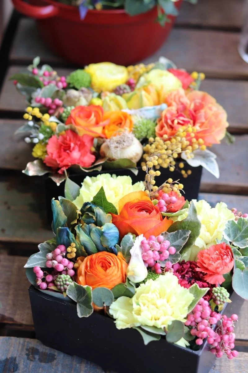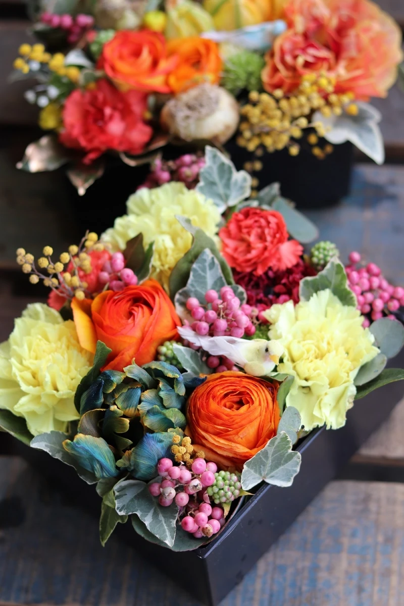 箱にぎ〜っしり花を敷き詰めるこちらのアレンジ。