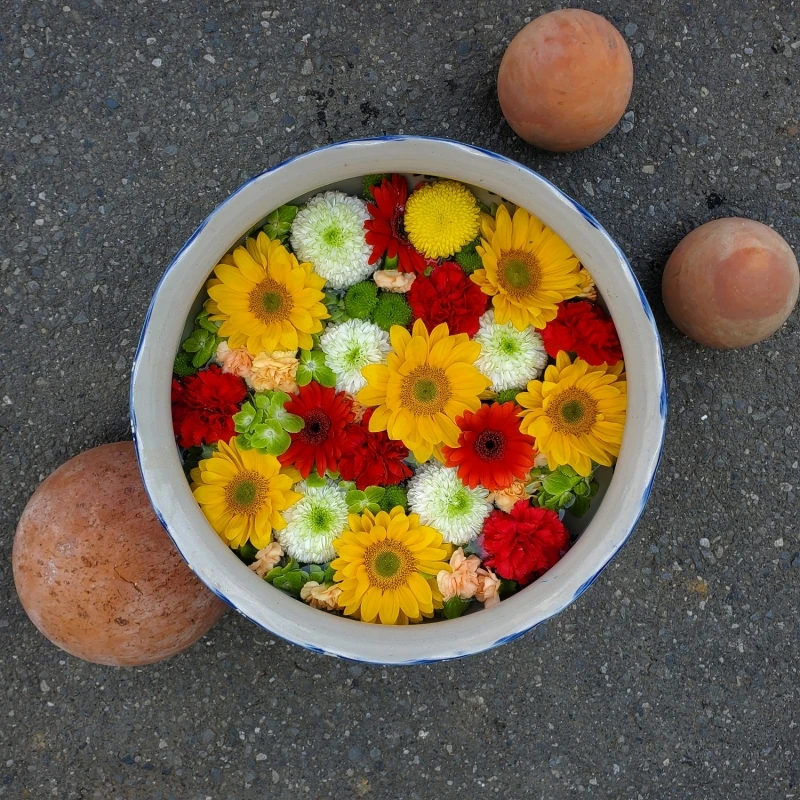 その代わりに参拝者に少しでも和んでもらおうと水の鉢を花々で飾るのが