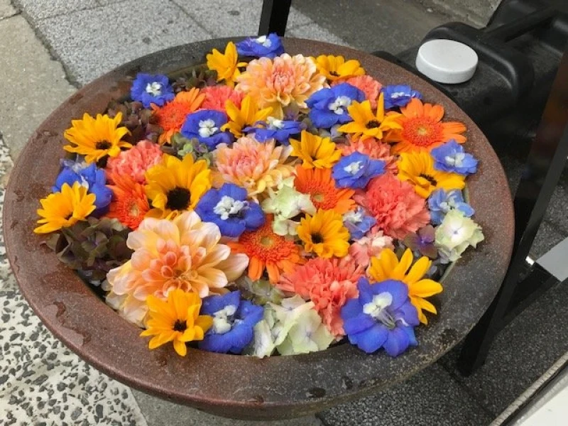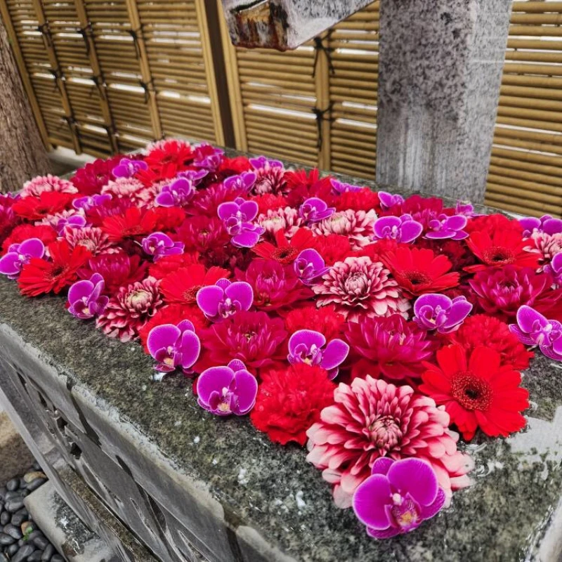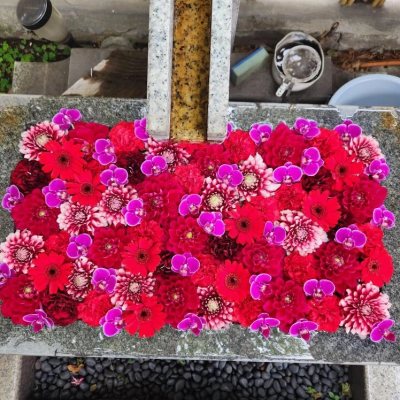 永代寺さんと其角さんの花手水はお互い目の前同士の立地なので対照的な色味にしてみました!