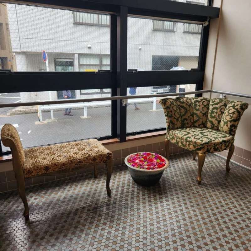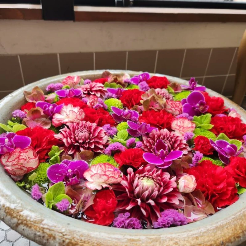 花手水鉢の置いた場所は建物入って左の階段を少し登った踊り場です!
