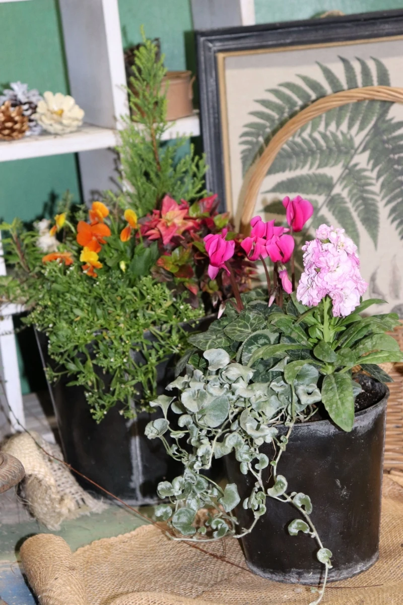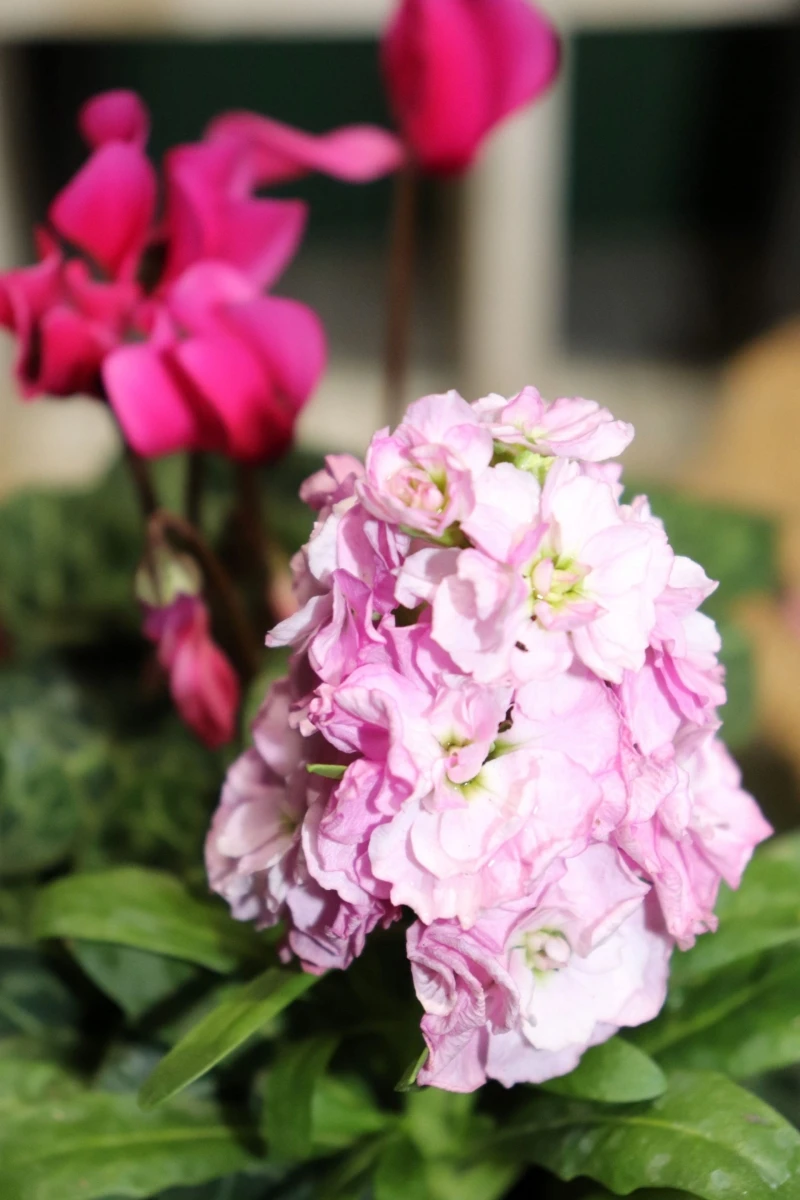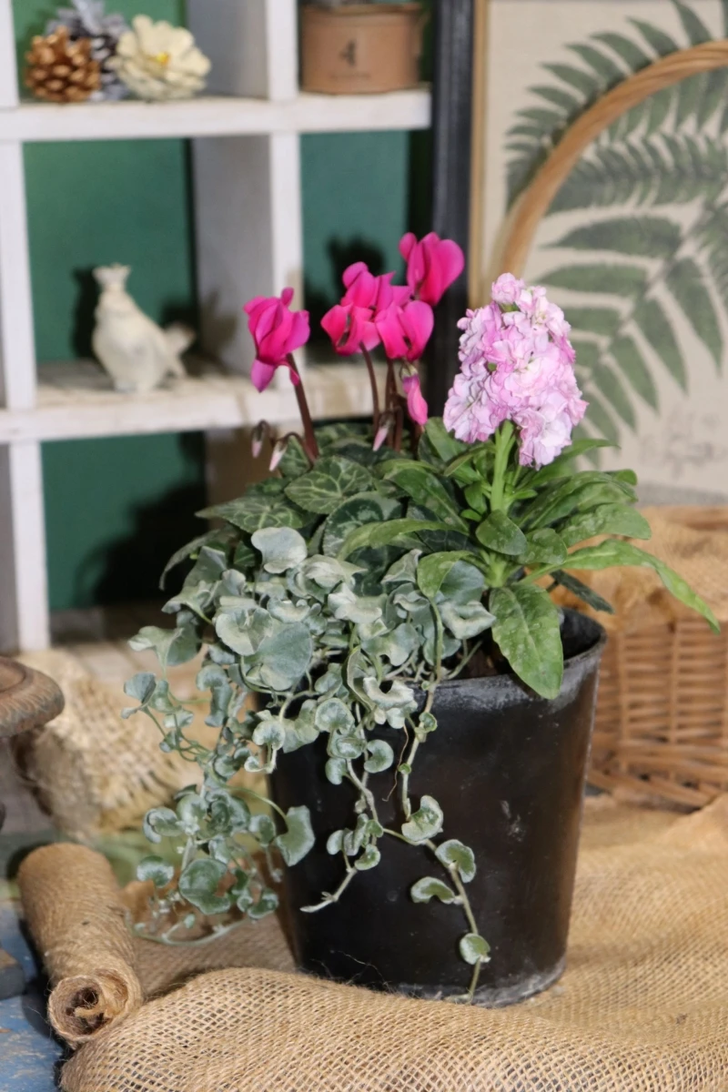 二つめはストックとシクラメンの欲張りセットな寄せ植えです。