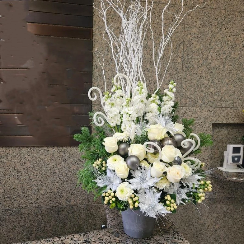 グレイッシュなカラーボールやシルバーのポインセチアフラワーも一緒に〜クリスマス感いっぱいです!!