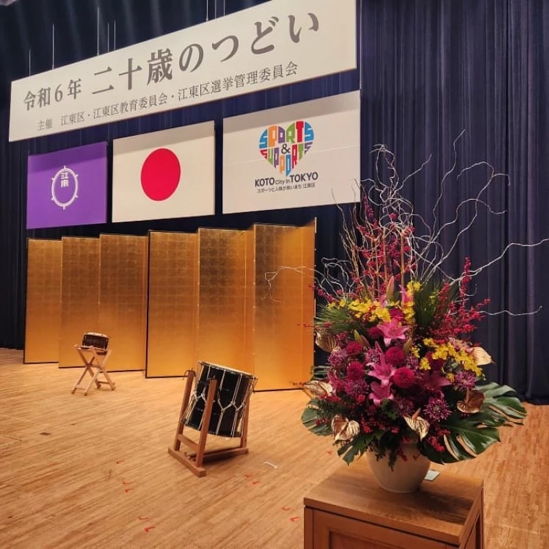 カワシマも早朝に無事、成人式の演台花をお納めすることができました!