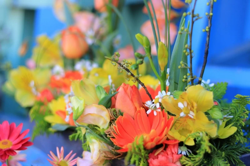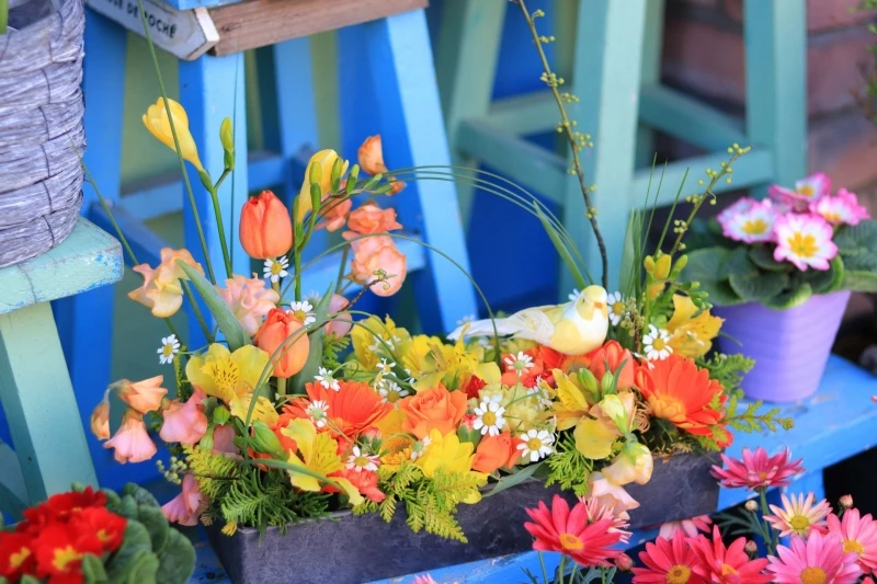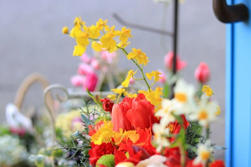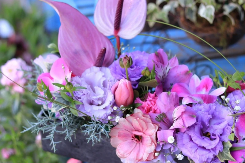 低く敷き詰めた花々に季節の枝やリーフ、茎のカーブがきれいな花などで動きをつけたオシャレなアレンジですよ♪
