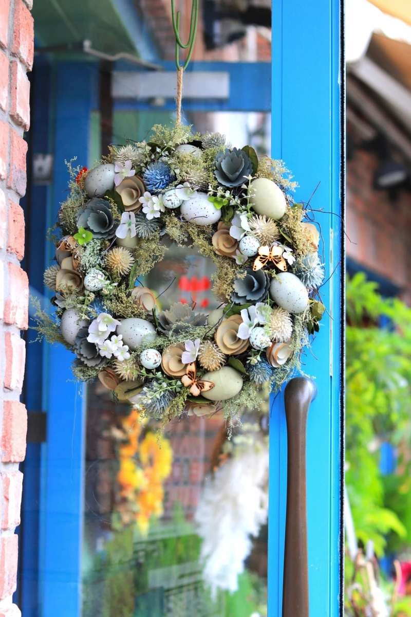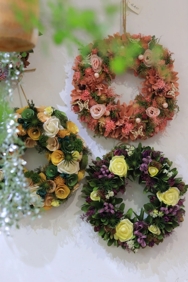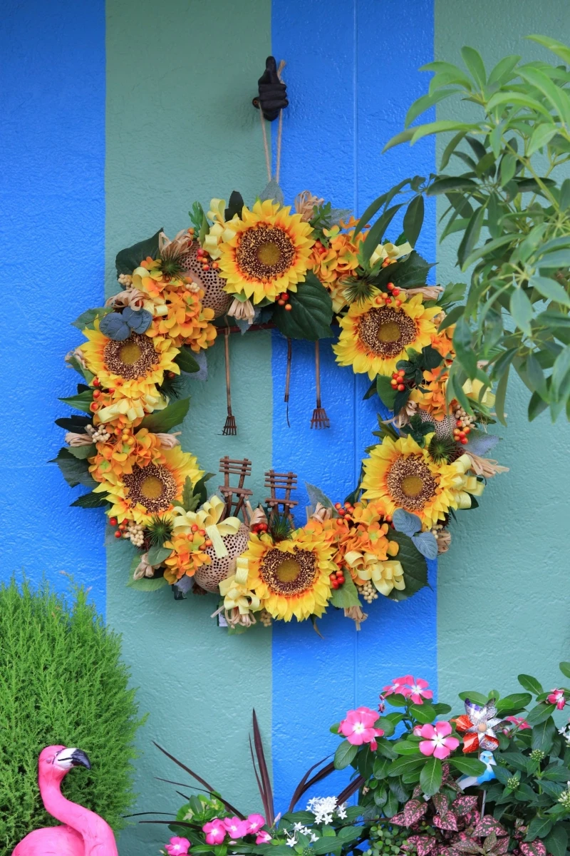 店舗正面には特大リースを飾っていますが、先日うれしい事にお求めいただいたので、さらに夏感アップしたヒマワリリースを作って飾りました‼