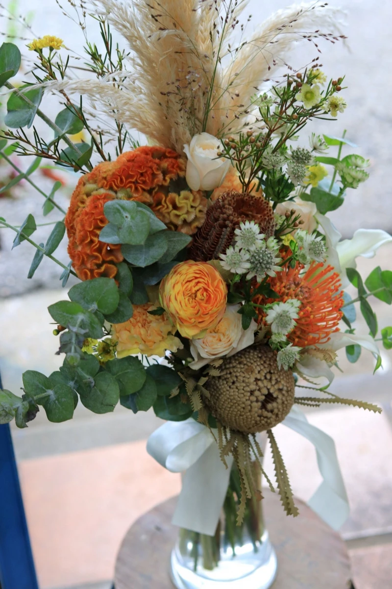 あとはネイティブフラワー(南アフリカ、オーストラリア産の花)もご希望でバンクシャー、ピンクッションを使いました。