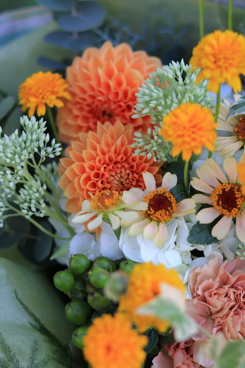 優しい色のダリアにジニア、ヒメヒマワリ、ベンケイソウなど