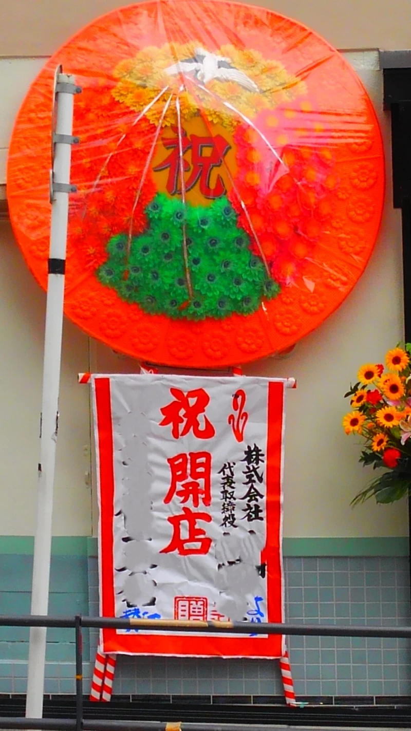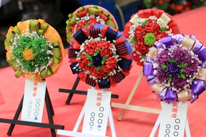 主に昭和の時代には開店祝いとして巨大な(直径150センチ超)造花の輪を店舗前に並べました。②の写真参照