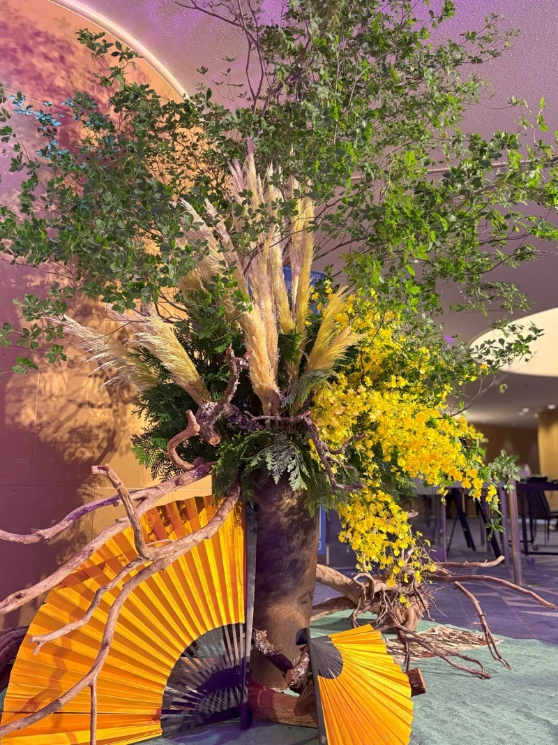ドウダンツツジの大枝、パンパスグラス他花材を次々と投げ込んでいきます。