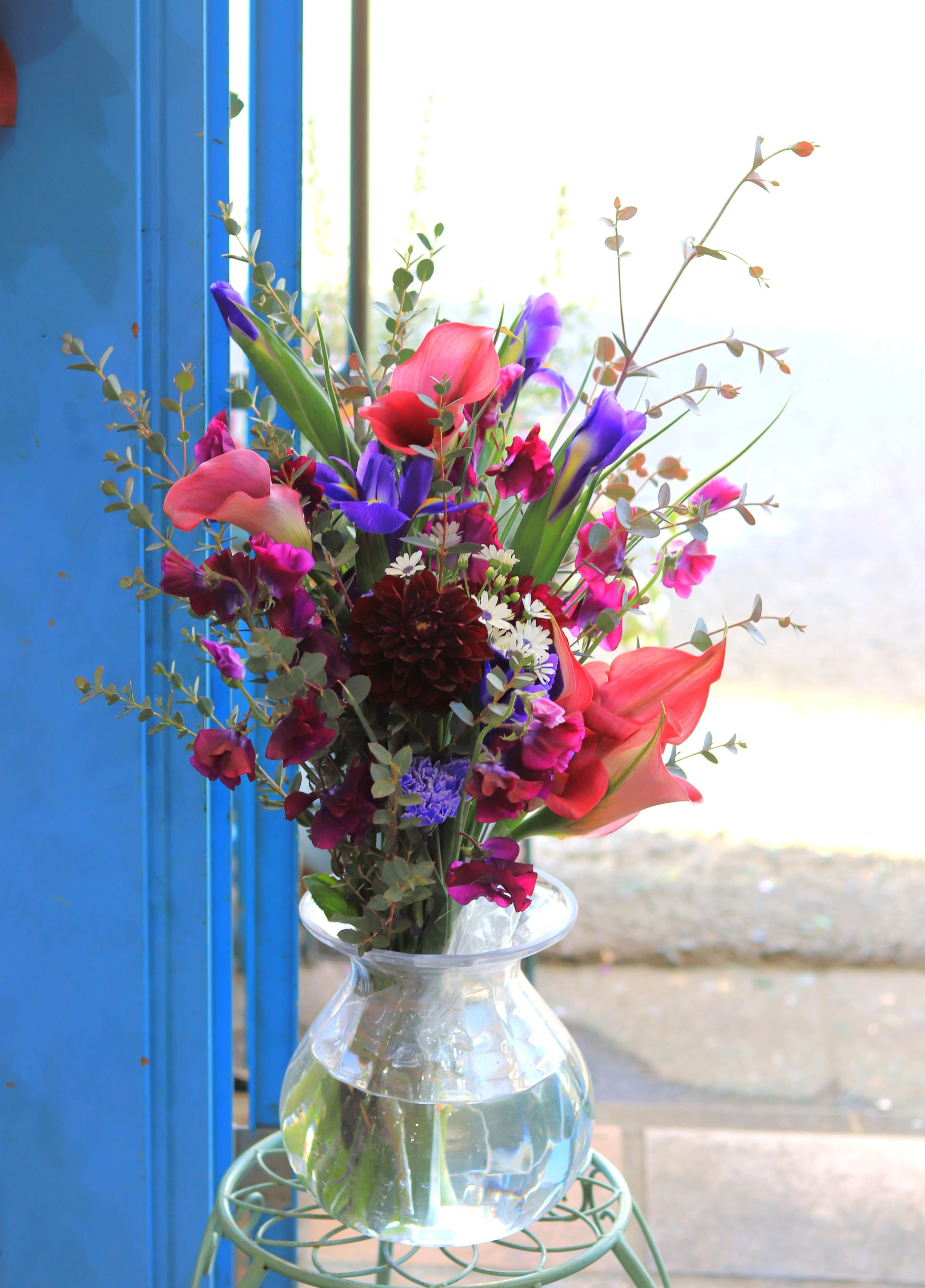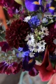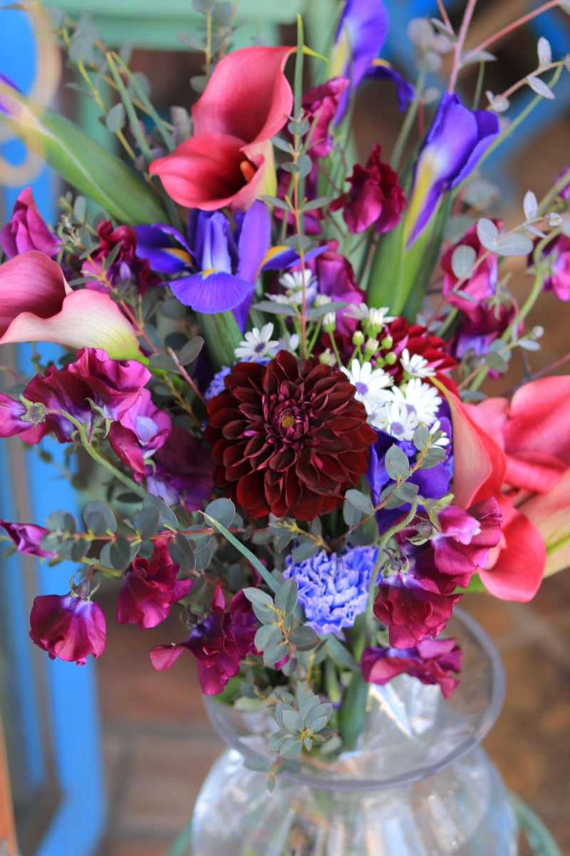 ワインレッドのダリアをメインに赤紫系の濃淡色はカラーやスイートピー等